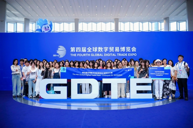师生在“GDTE”第四届全球数字贸易博览会主标识前合影