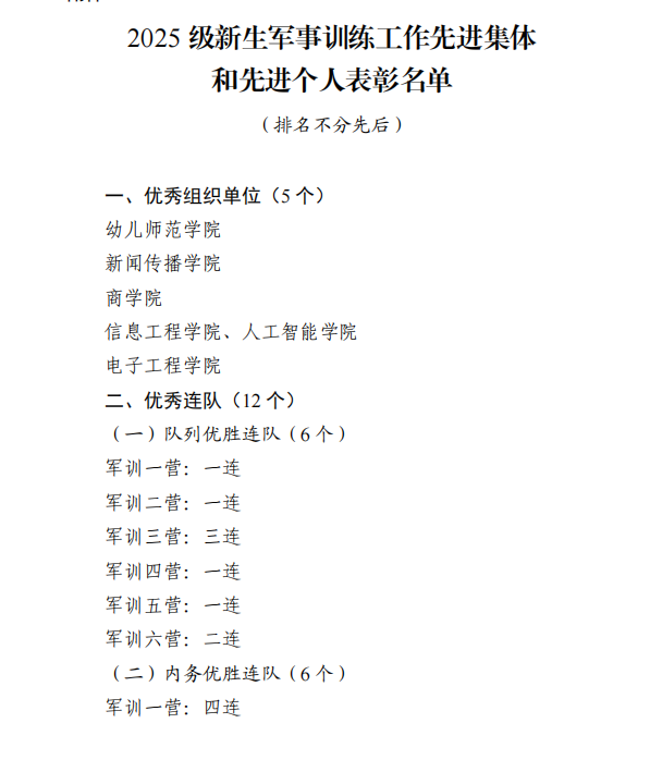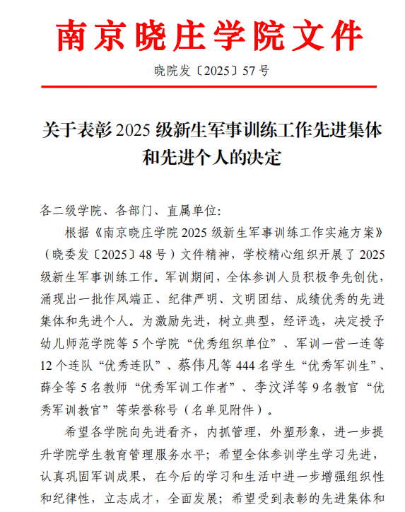 为了全面贯彻党的教育方针,落实立德树人根本任务,锤炼学生意志品质,9月6日至18日,我校顺利完成了2025级学生军训工作。军训期间,全体参训人员积极争先创优,涌现出一批作风端正、纪律严明、文明团结、成绩优秀的先进集体和先进个人。