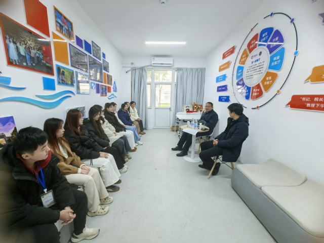 12月12日下午,D区“一站式”学生社区内暖意融融、笑语声声。商学院辅导员工作室“合一会客厅”特邀副校长王本余,教务处处长袁俊与23财务管理1班学生代表共聚一堂,举办了一场轻松温馨的座谈交流。活动围绕生涯规划、学业支持、困难帮扶、班级建设、就业创业等话题展开深入对话,共话成长路径。