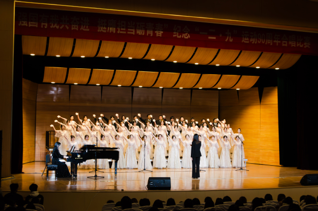 12月9日,我校“强国有我共奋进 挺膺担当砺青春”纪念“一二·九”运动90周年合唱比赛在方山校区音乐厅隆重举行。商学院合唱团选曲《如愿》亮相舞台。