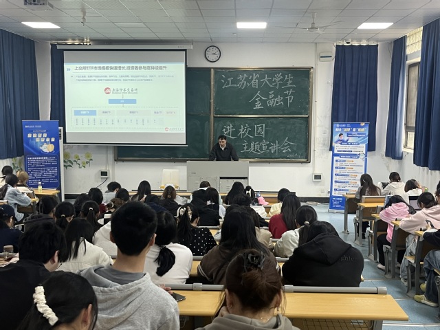 在元培楼100教室,“金融知识进校园”主题宣讲同样精彩纷呈,东吴证券投资顾问伏鑫老师以《高质量发展的上交所ETF市场暨防诈宣传》为题,为100余位同学带来一场专业生动的讲座。伏鑫老师以通俗易懂的语言,系统梳理了证券市场的基础框架与运行机制,帮助同学们建立起对金融市场的整体认知。他结合自身丰富的行业经验,深入剖析了金融领域的职业发展路径与核心能力要求,并重点揭示了非法集资与金融诈骗的常见手法及危害,切实提升了同学们的风险识别能力与自我保护意识。