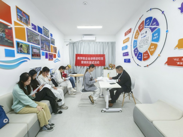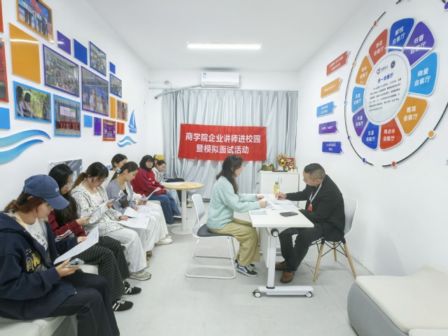 为切实提升学生求职竞争力,帮助学子提前适应公考及国企央企面试场景,4月14日下午2点,商学院在D区“一站式”学生社区“合一会客厅”成功举办“企业讲师进校园暨模拟面试”主题活动。本次活动特邀校外资深面试专家、企业执行总监凌斌担任评委,采用结构化面试形式,为同学们带来一场沉浸式、高还原度的求职演练。