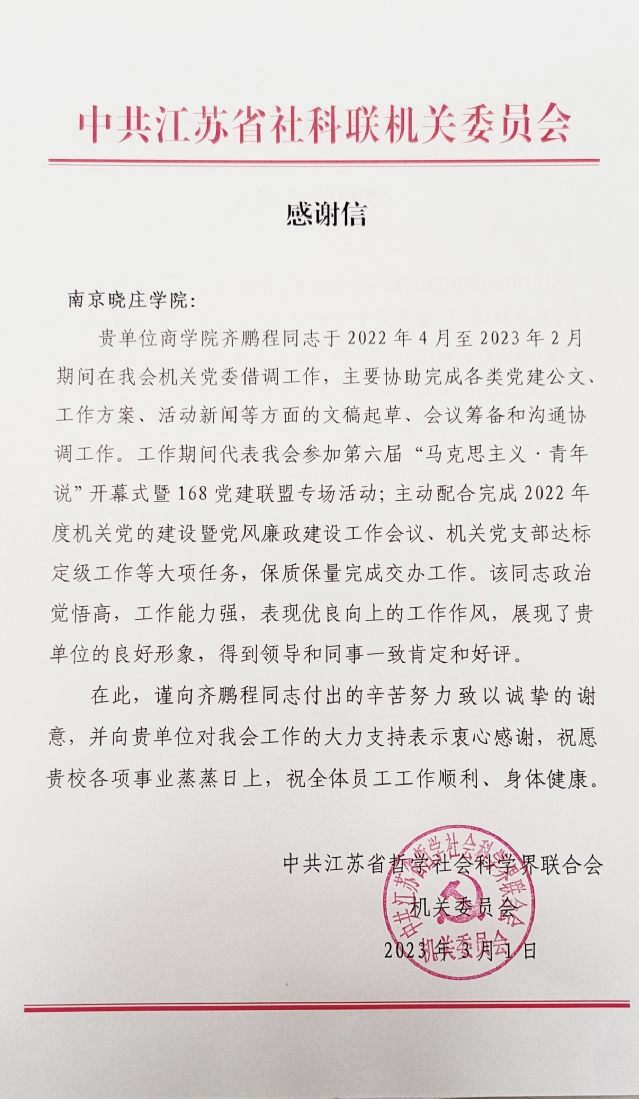 江苏省社科联近日向我校发来感谢信,感谢我院教师齐鹏程在江苏省社科联机关党委借调期间作出的贡献。